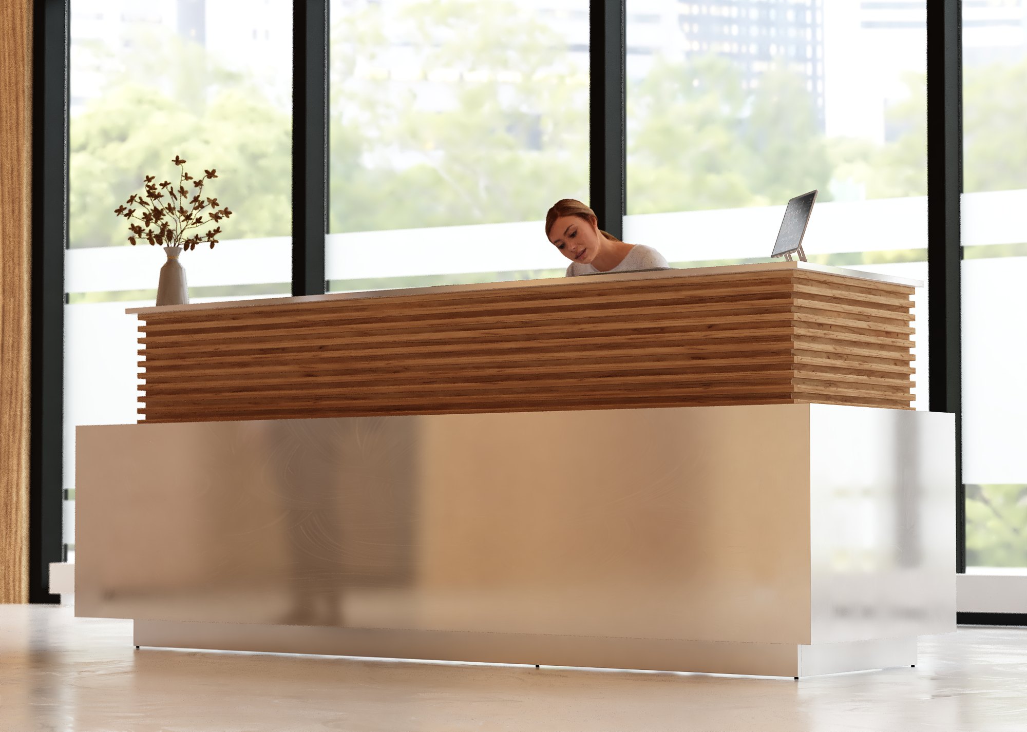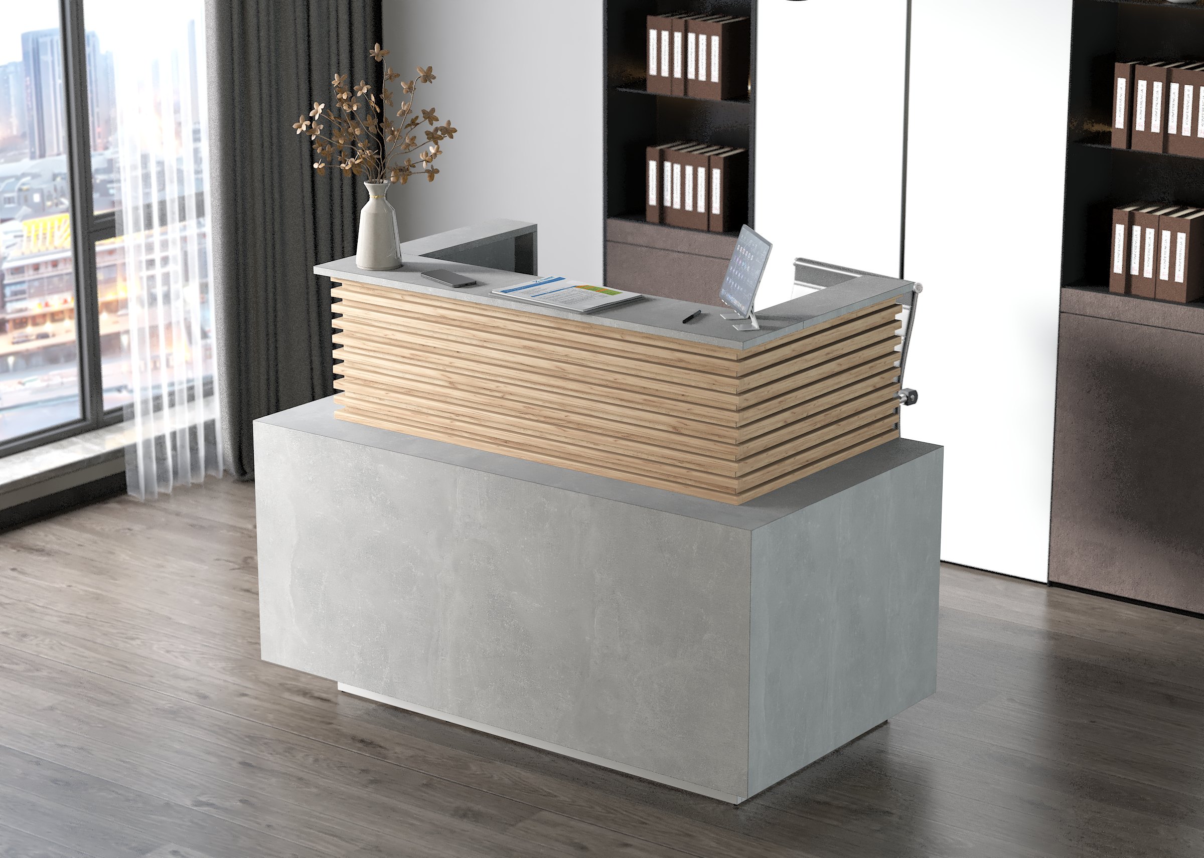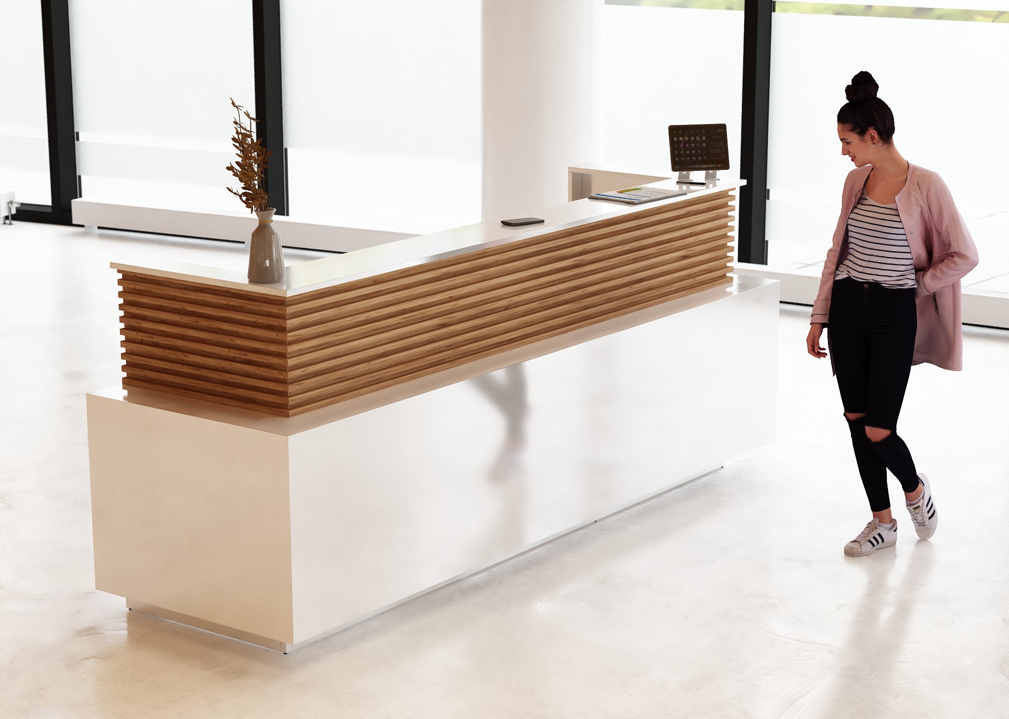 Prosta bryła przełamana rewelacyjnie poziomymi lamelkami w naszej recepcji R121 to propozycja uniwersalna. Prosta bryła prostopadłościanu ubogacona efektownymi i modnymi lamelkami ładnie odświeży kilkuletnią przestrzeń recepcyjną ale także z pazurem umebluje nowo powstały obiekt.
