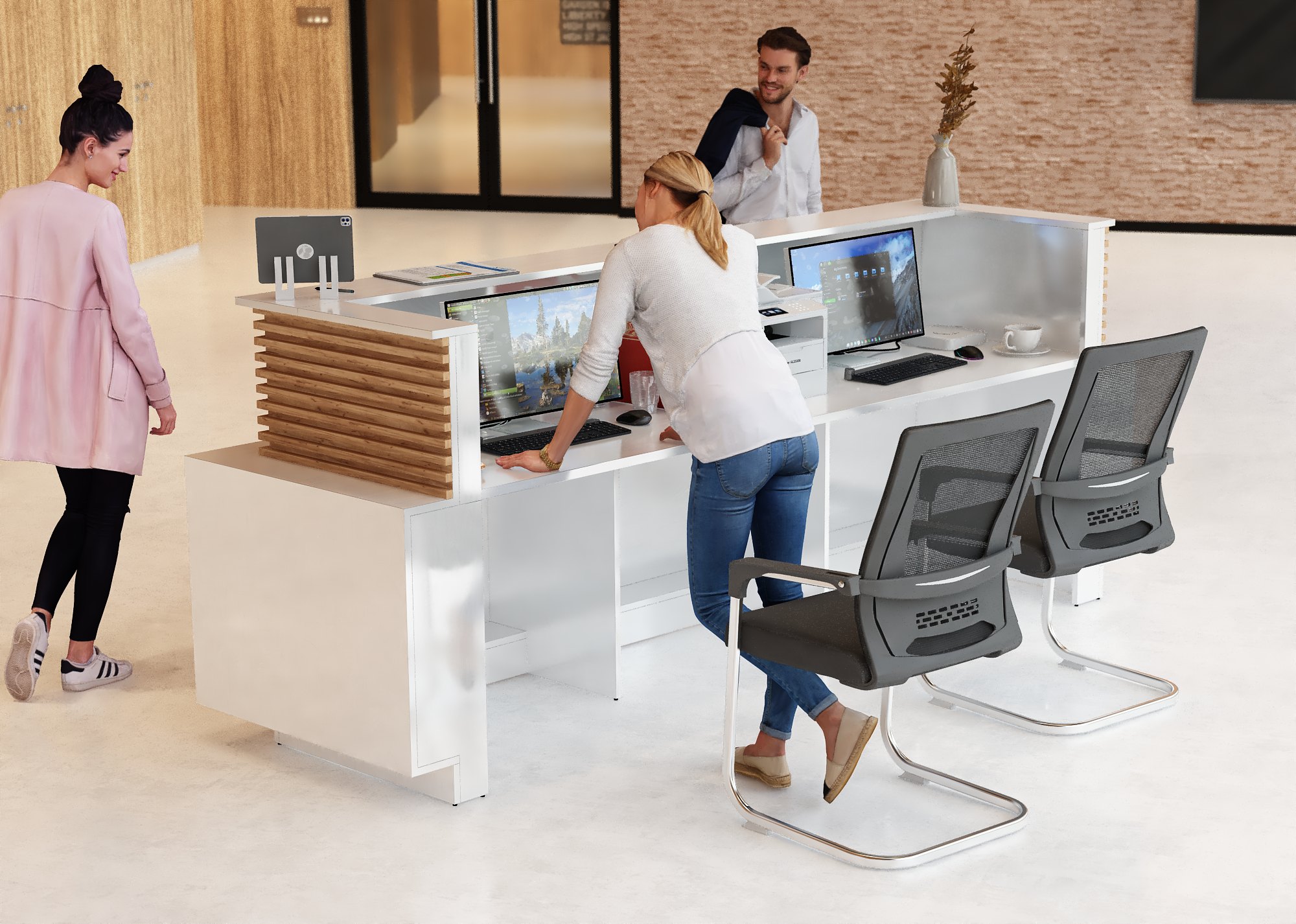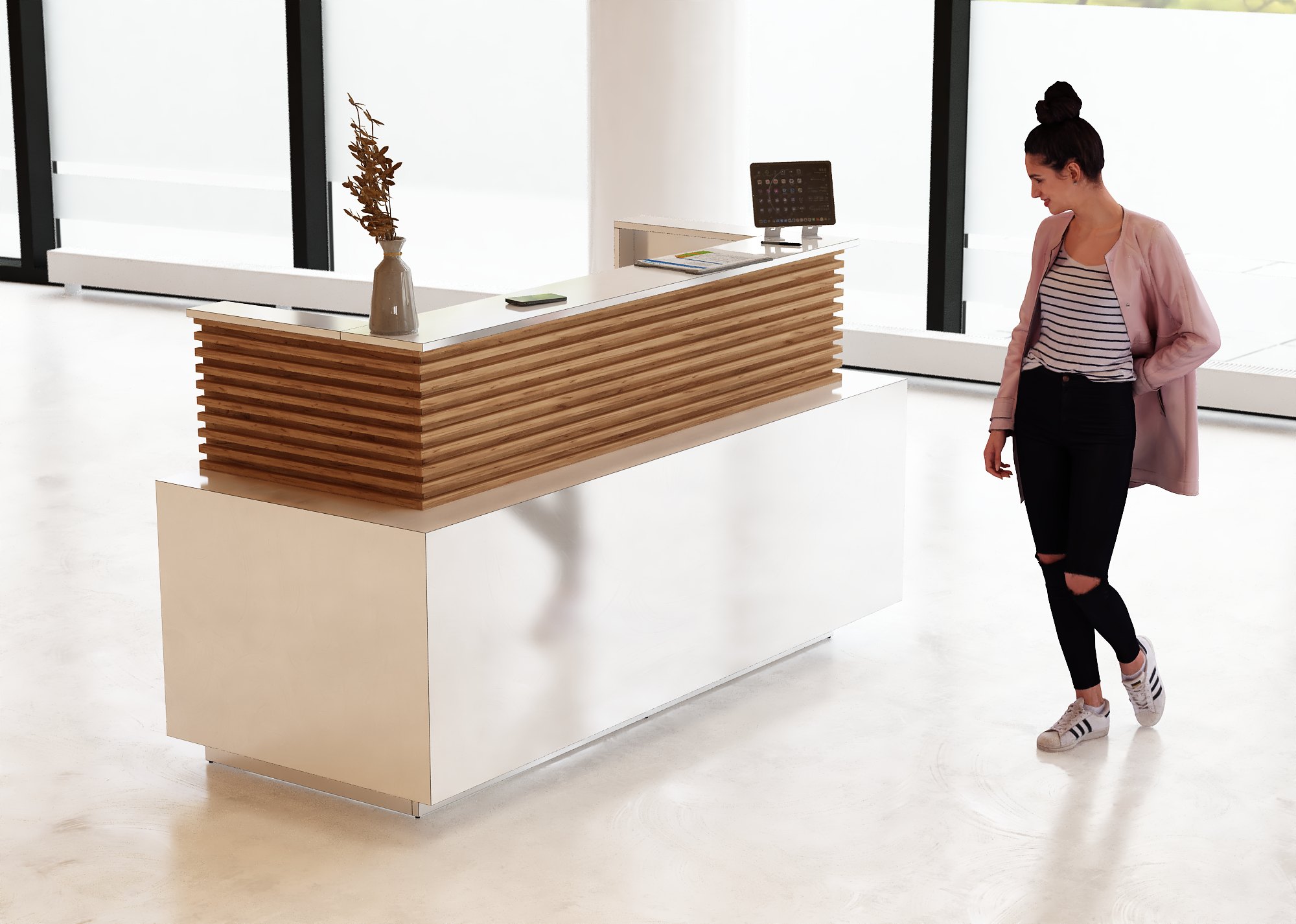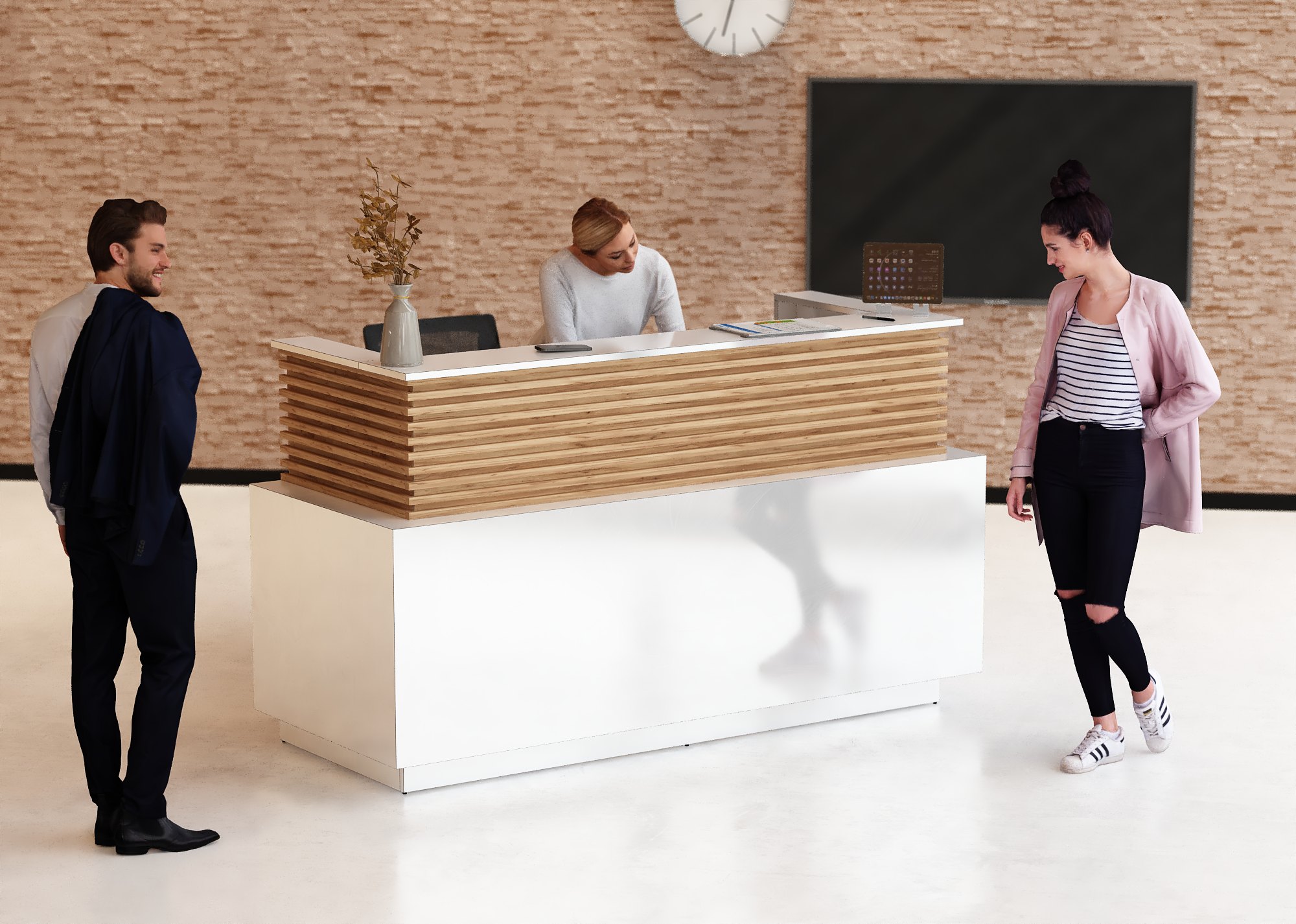 Prosta bryła przełamana rewelacyjnie poziomymi lamelkami w naszej recepcji R121 to propozycja uniwersalna. Prosta bryła prostopadłościanu ubogacona efektownymi i modnymi lamelkami ładnie odświeży kilkuletnią przestrzeń recepcyjną ale także z pazurem umebluje nowo powstały obiekt.
