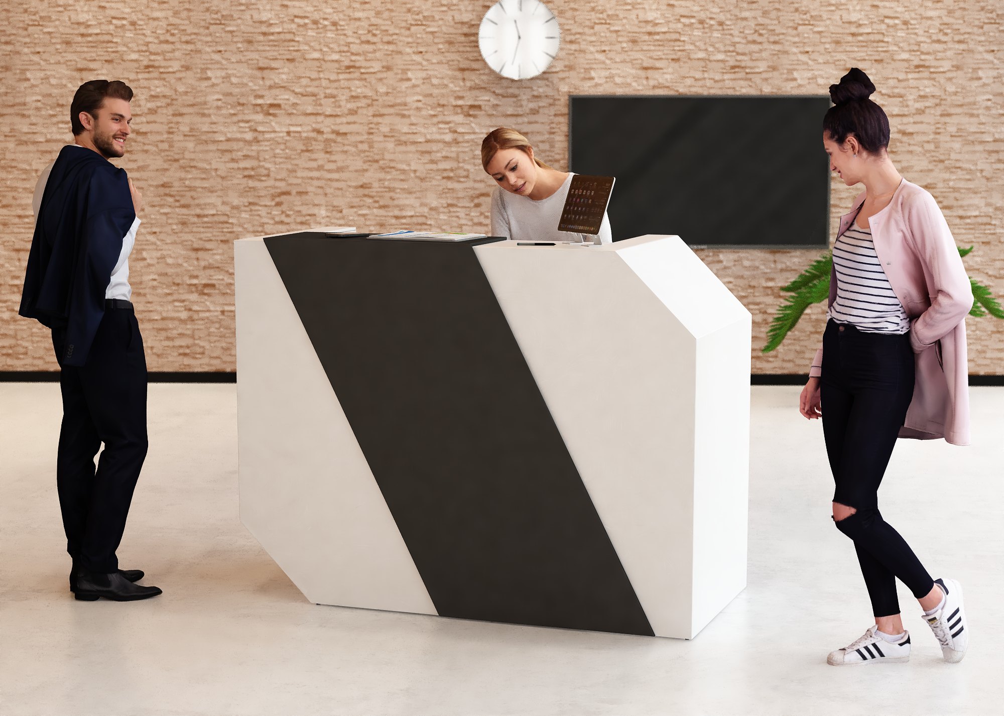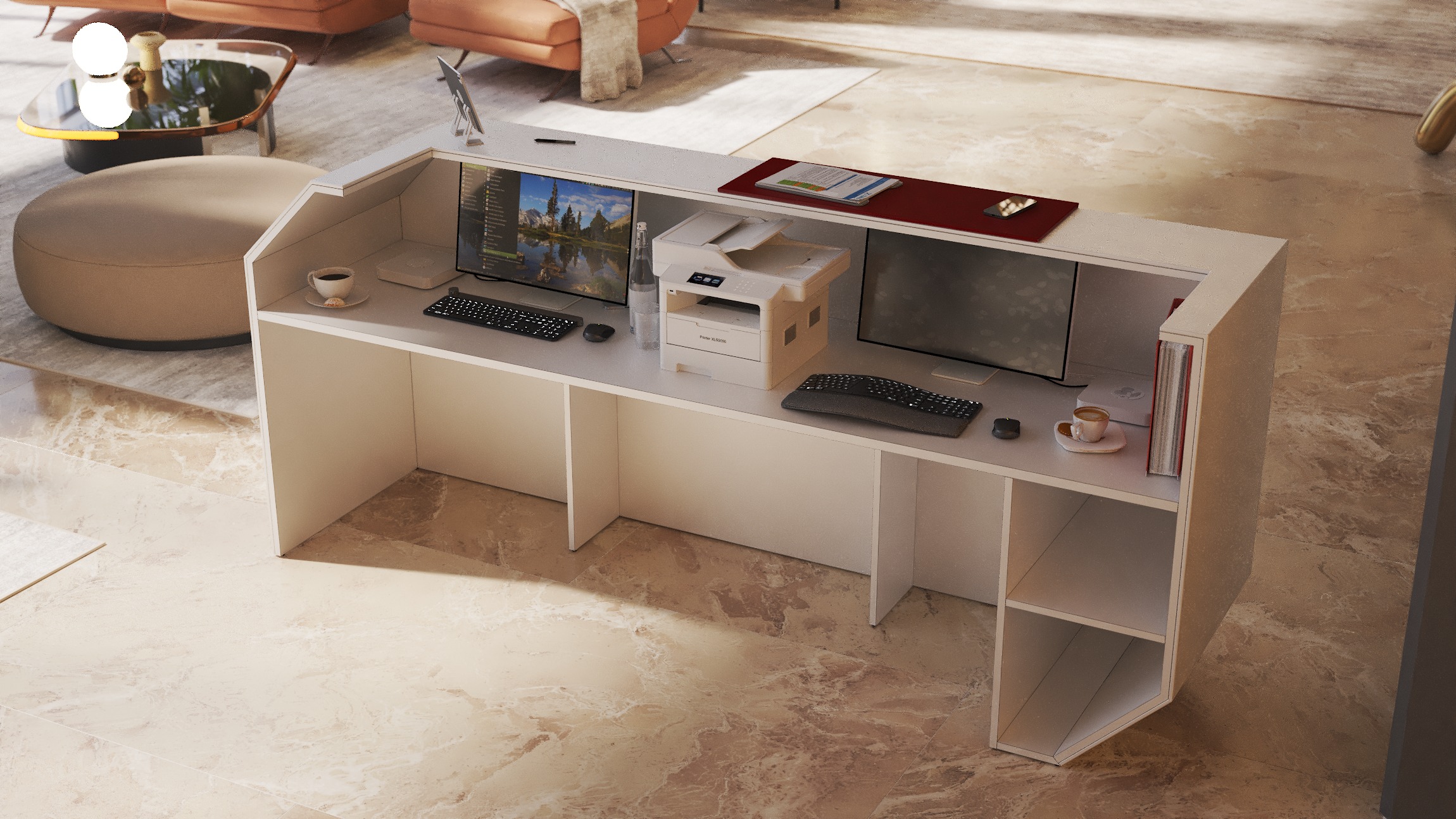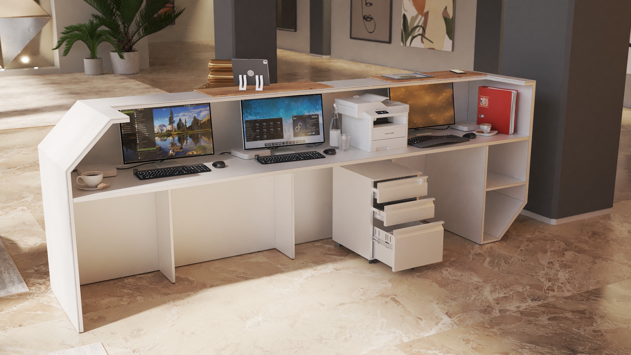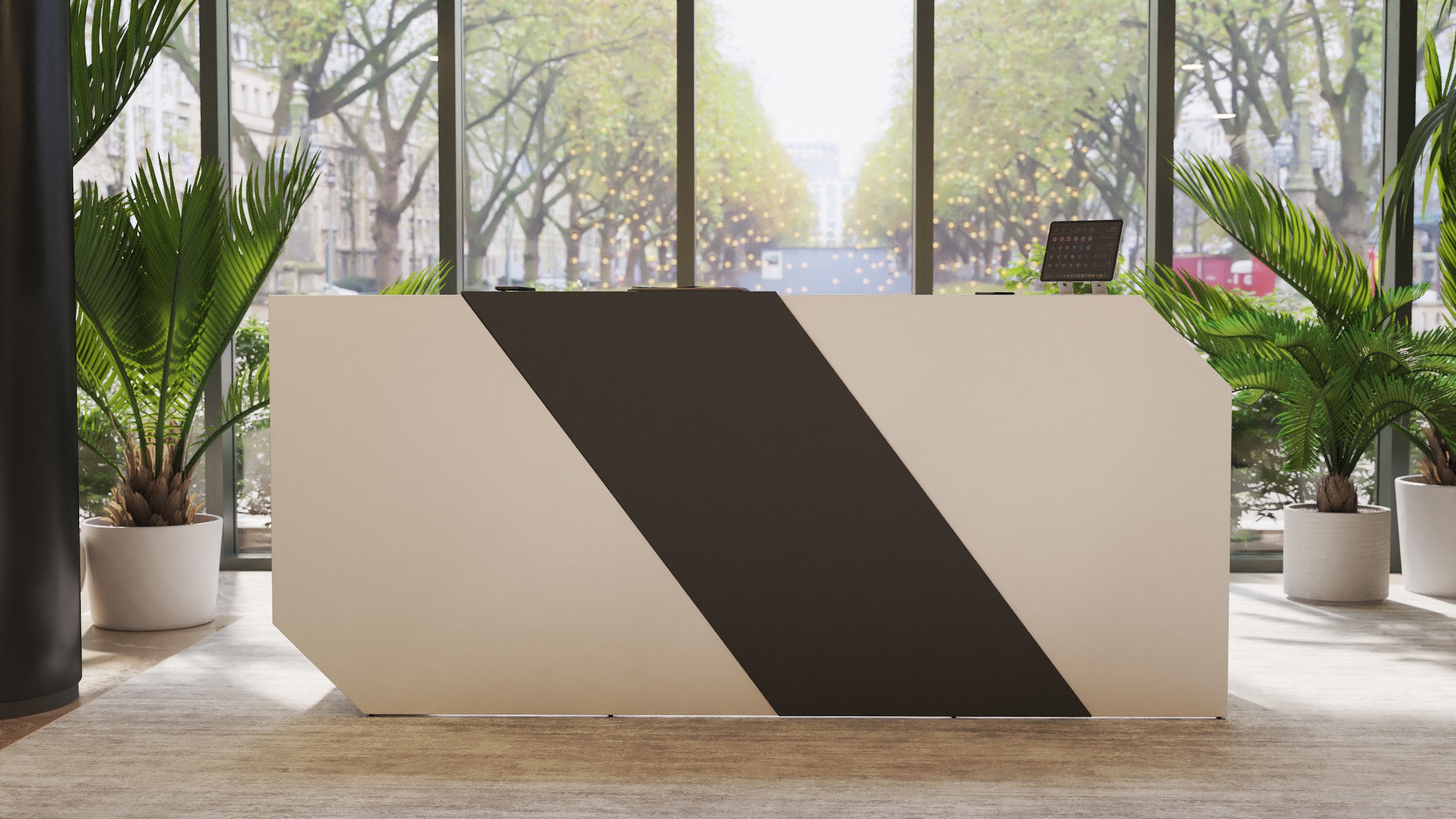 Monolityczna bryła o gładkiej i geometrycznej bryle to recepcja R154. Ciekawe cięcia otulone bezrantowym corianem już na pierwszy rzut oka wydają się luksusowe. Ciekawie nadgryziony korpus z elementami kontrastowymi tworzy nowoczesna całość. Recepcja R154 to wybór dla odbiorców ceniących najwyższą jakość i nowoczesne rozwiązania.