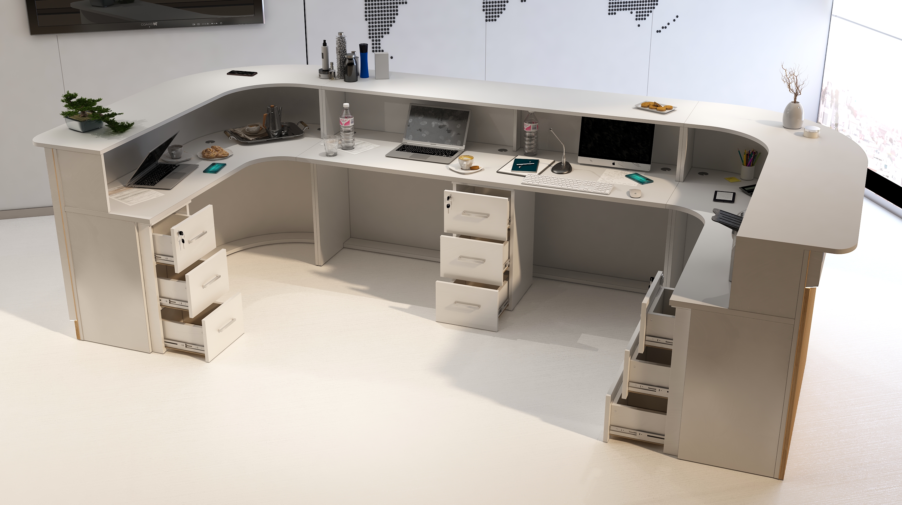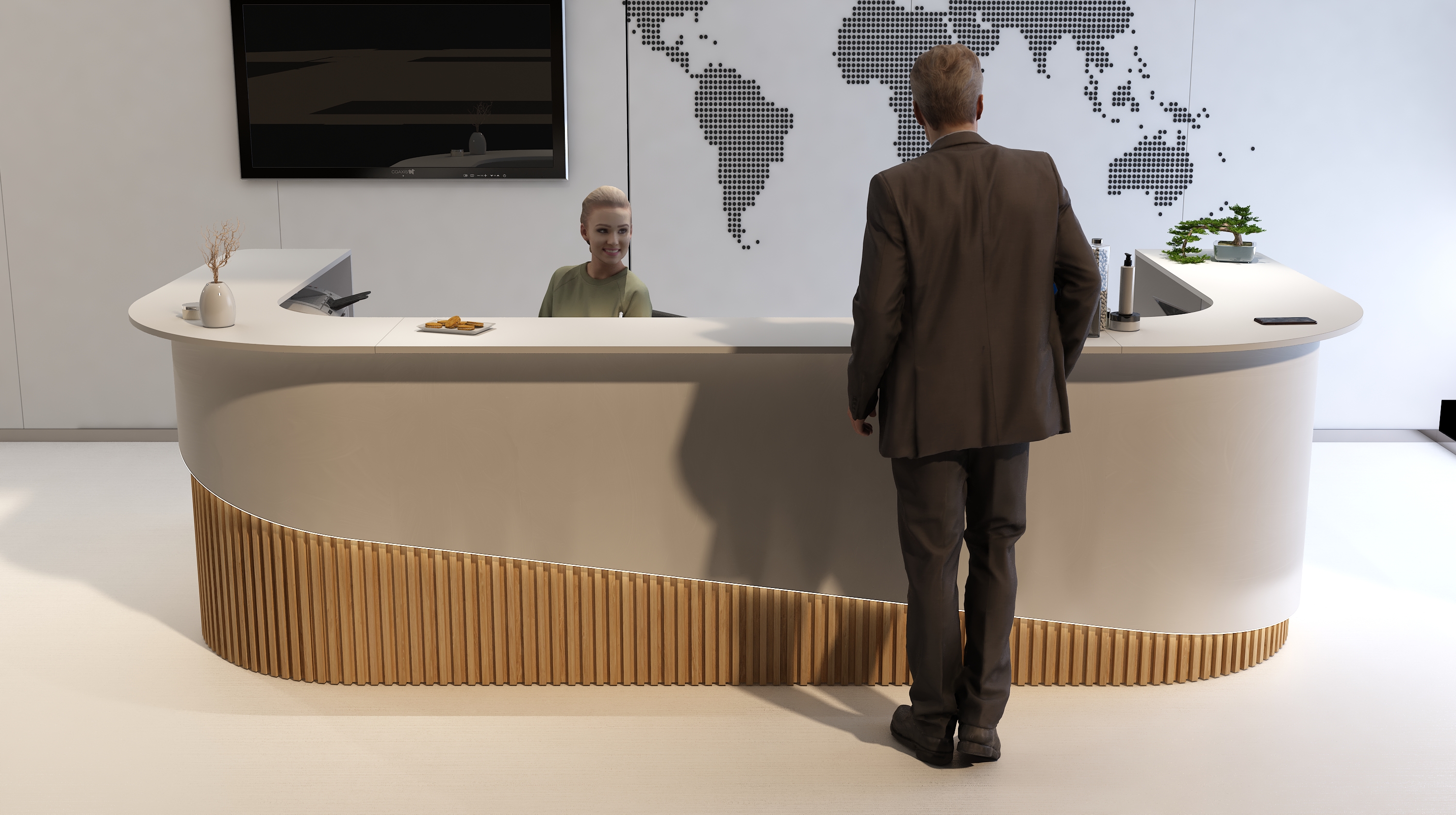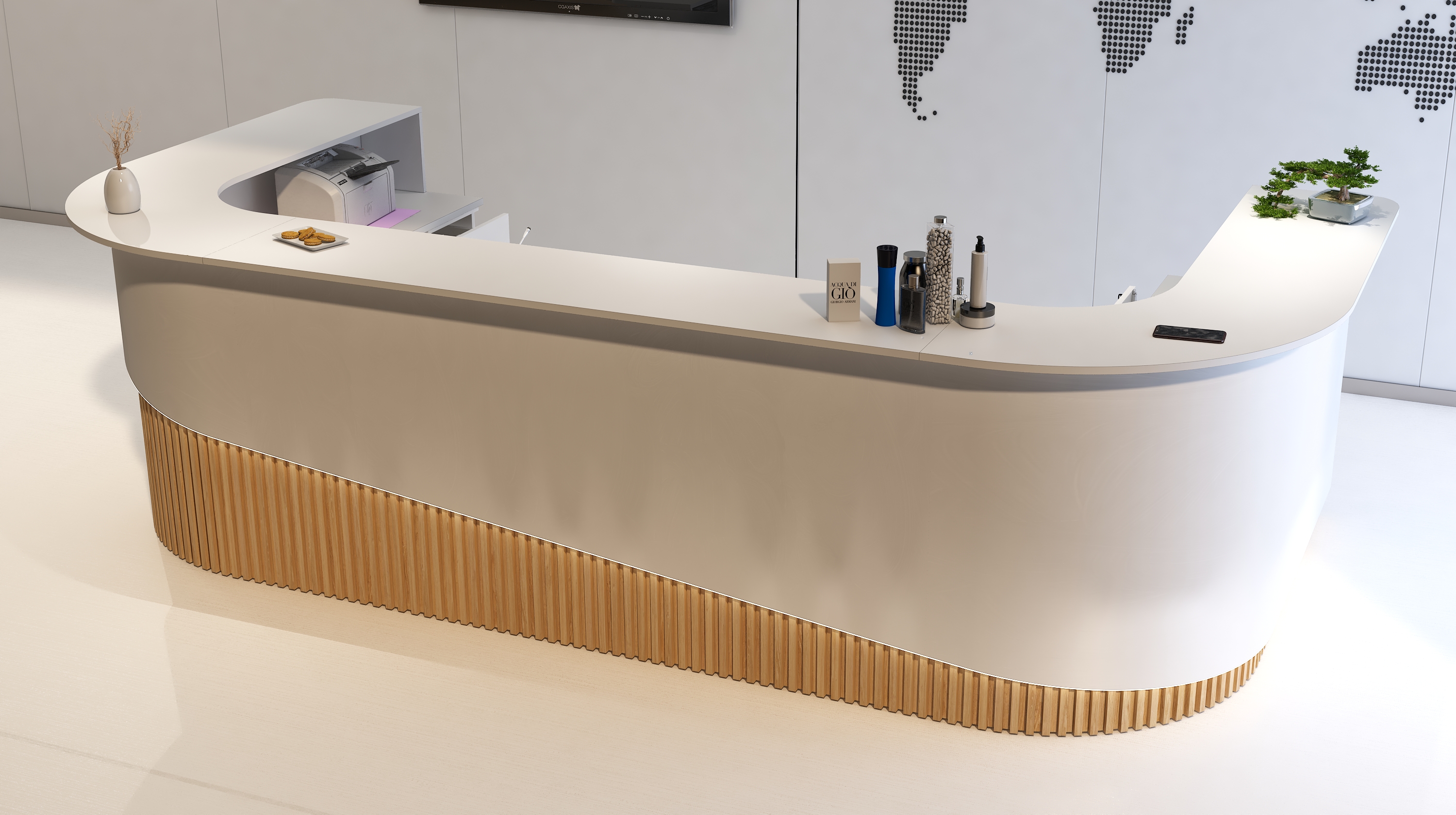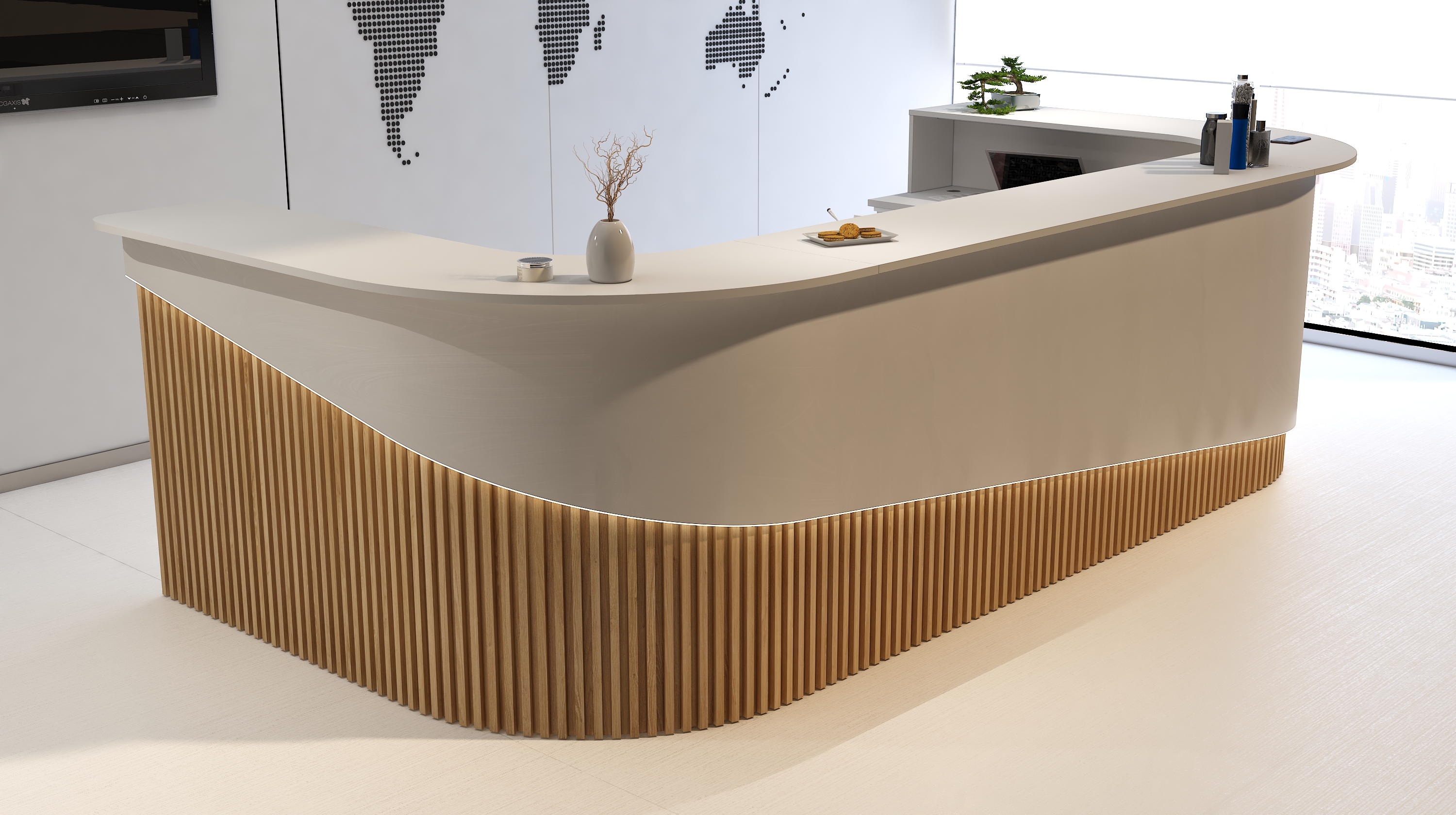Piękny półkolisty kształt wzbogacono szlachetnymi dębowymi lamelami i tak recepcja R199 nabrała życia. Najwyższa jakość materiałów: laminatów i żywego drewna zestawiona odpowiednio na pięknym i reprezentacyjnym froncie lady R199 to kwintesencja luksusu, elegancji i ponadczasowego wizerunku Państwa recepcji.