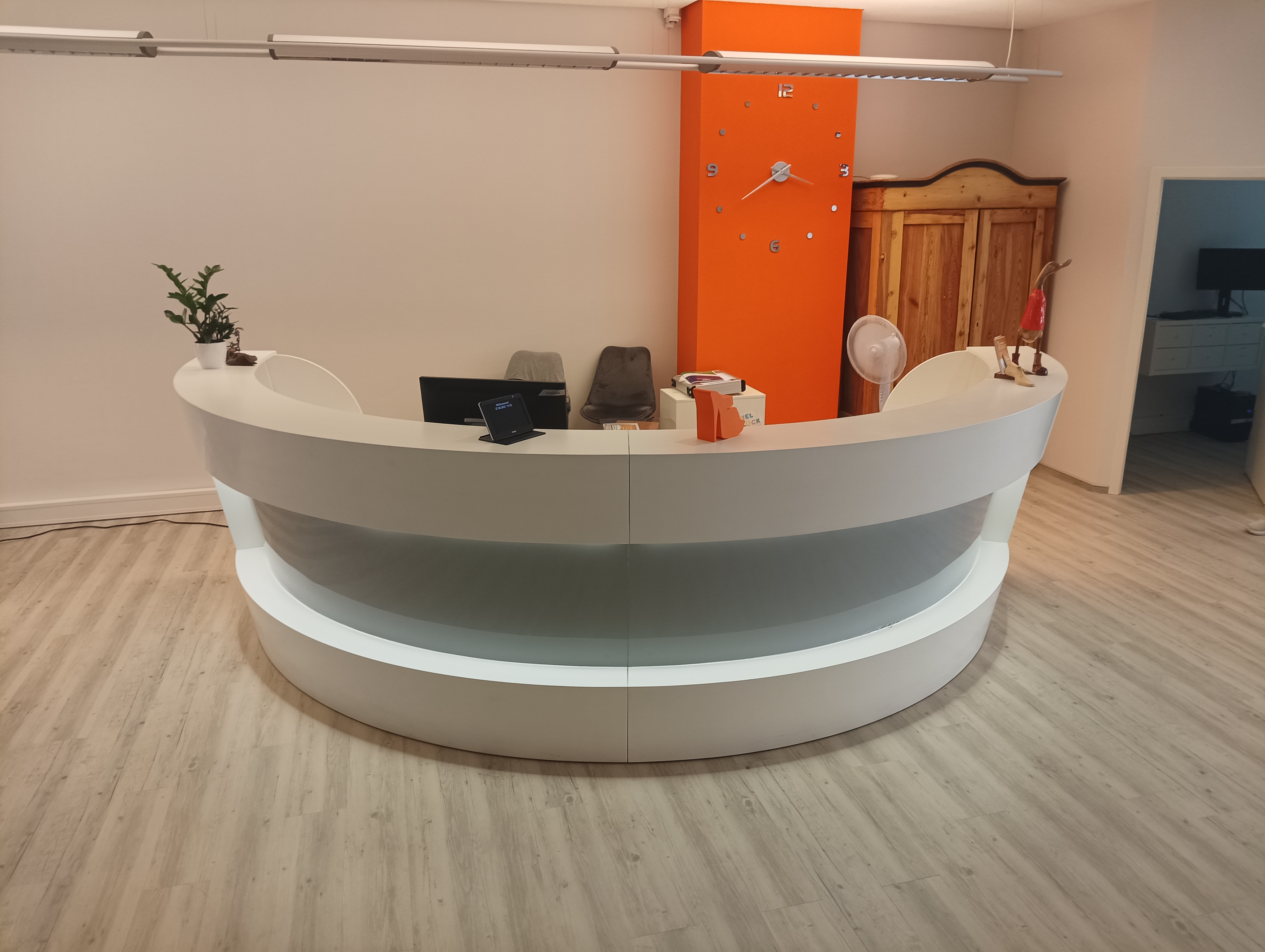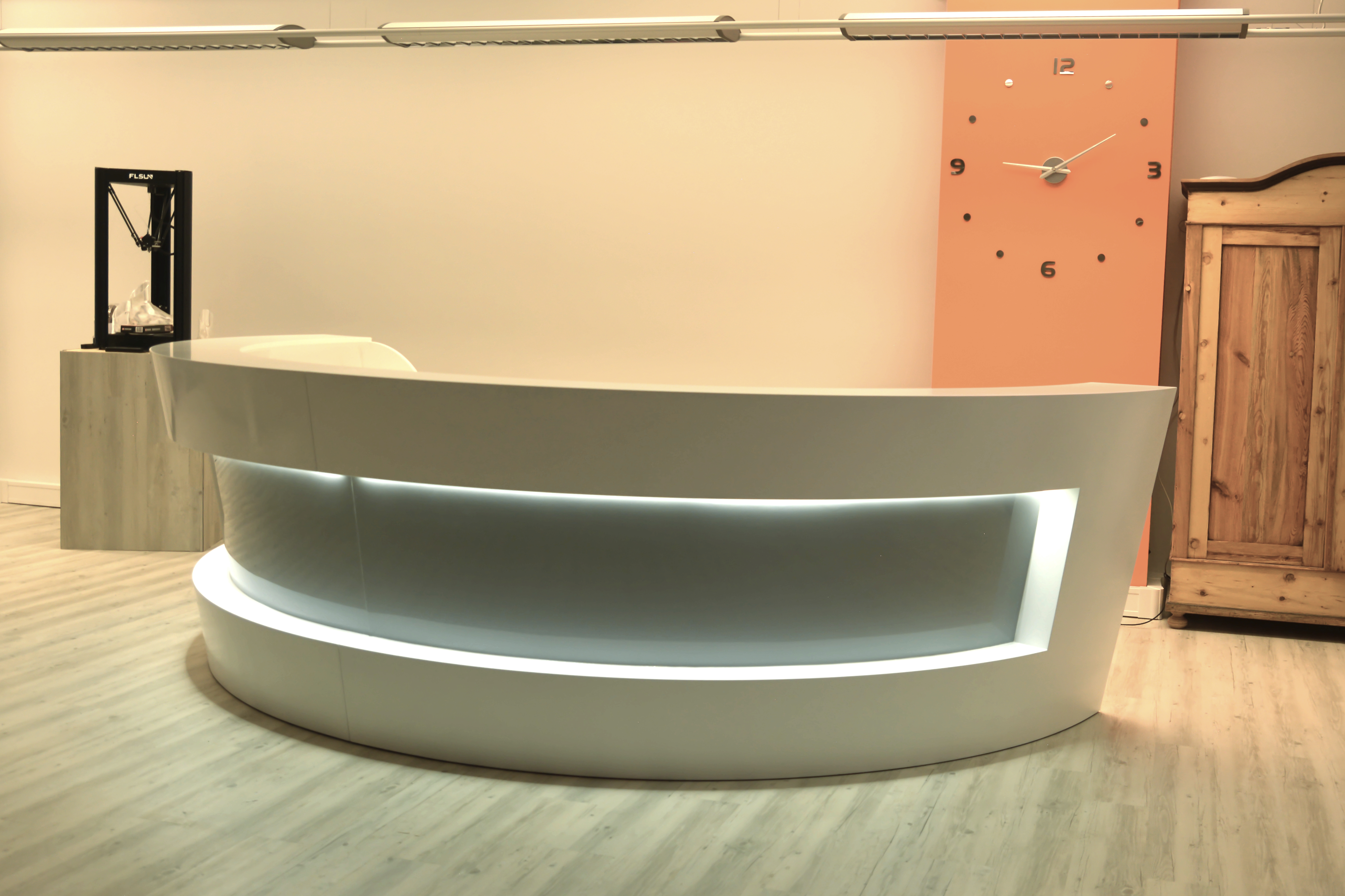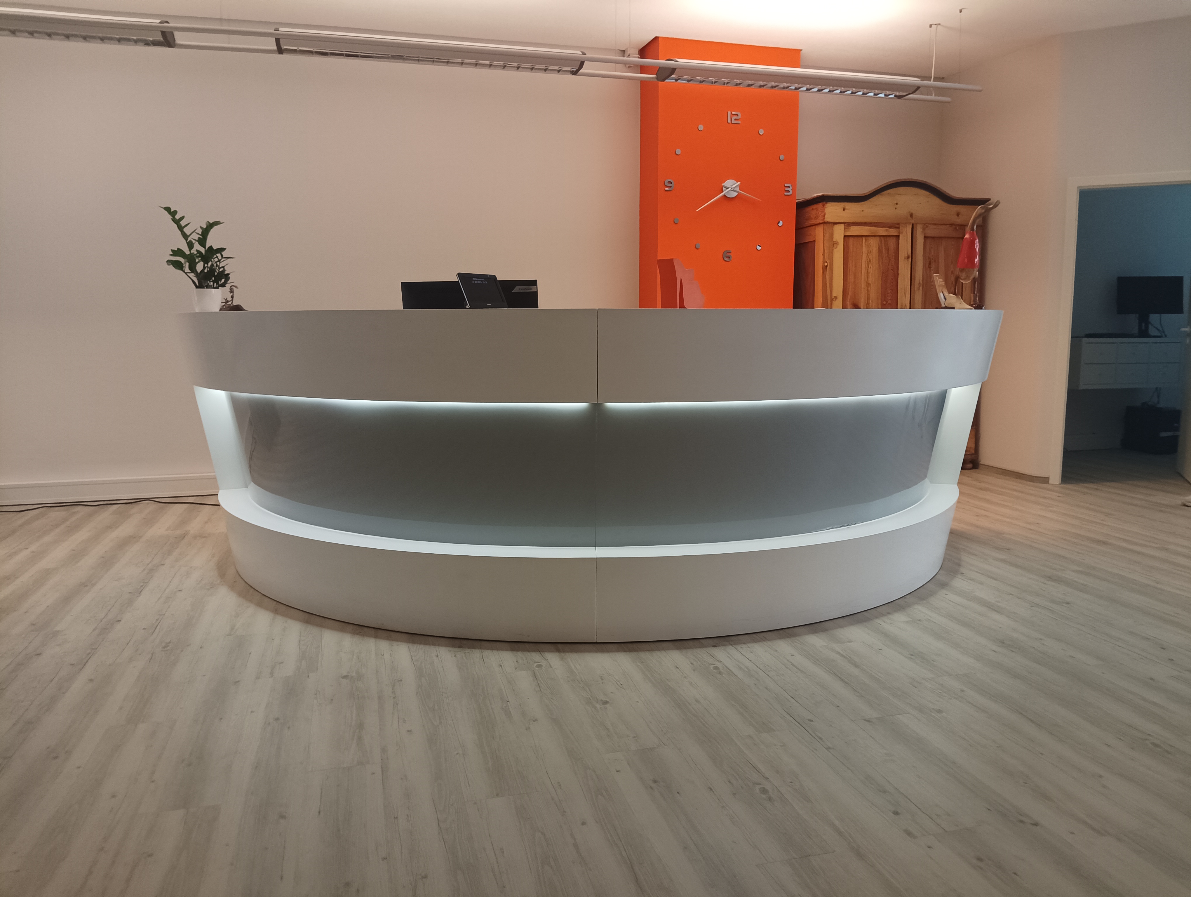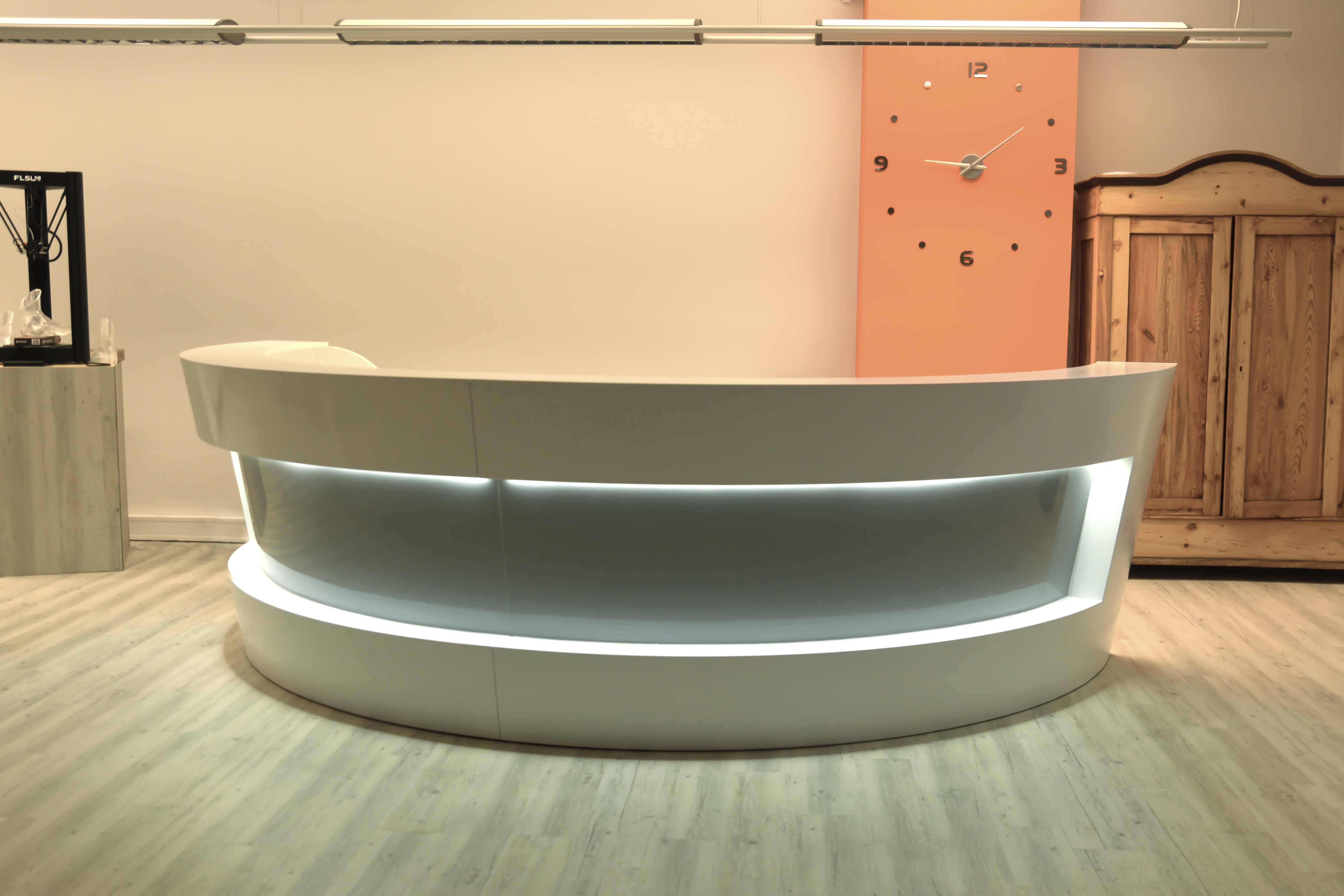 Łogodny łuk schylający się ku ziemi to wyrafinowana recepcja R206. Podwójne, obłe skosy wykonanane z laminatów z wcięciem kontrastującym z całą bryłą stworzą nadzwyczajną architekturę miejsca, które przez recepcję R206 będzie reprezentowane.