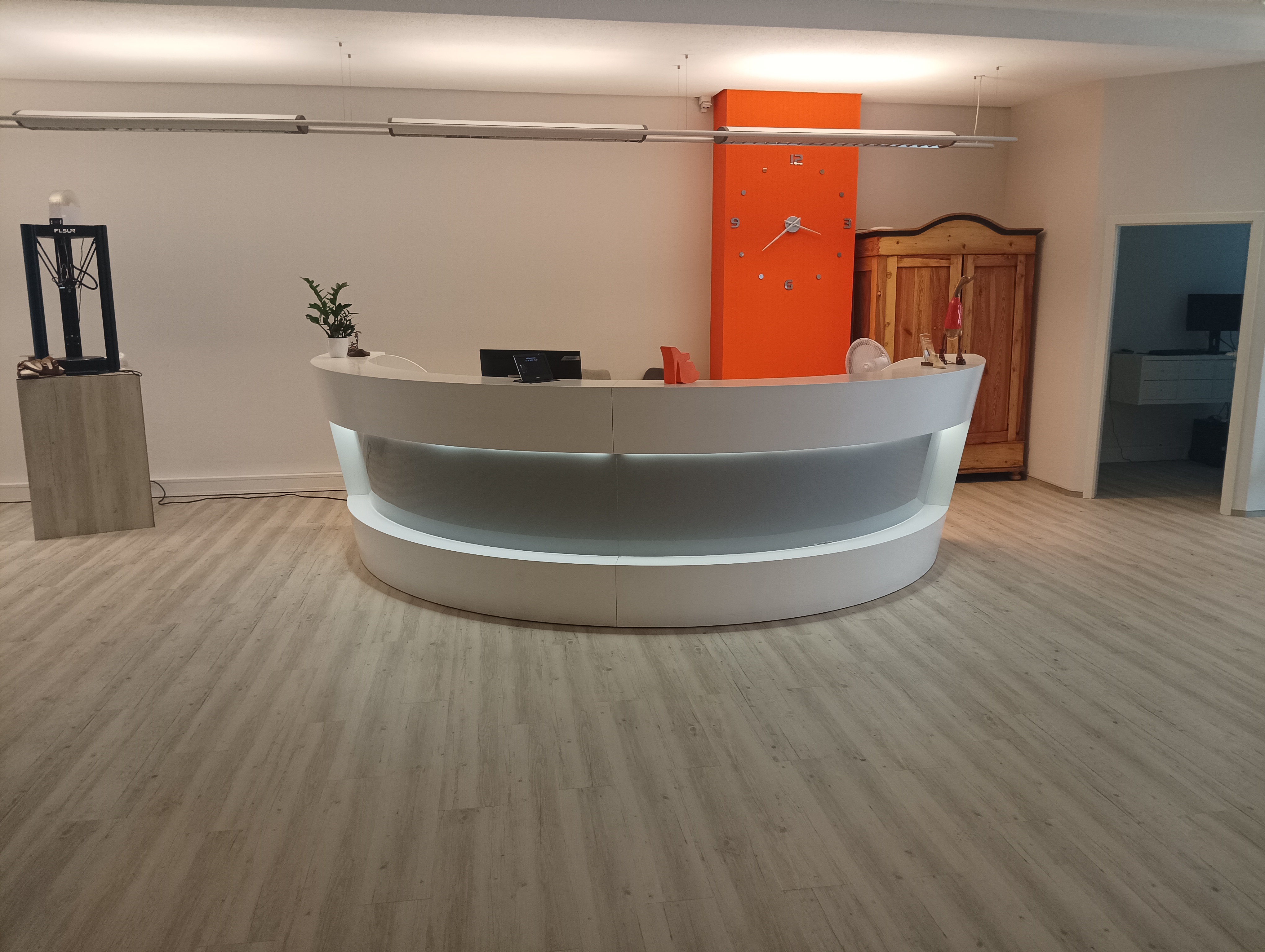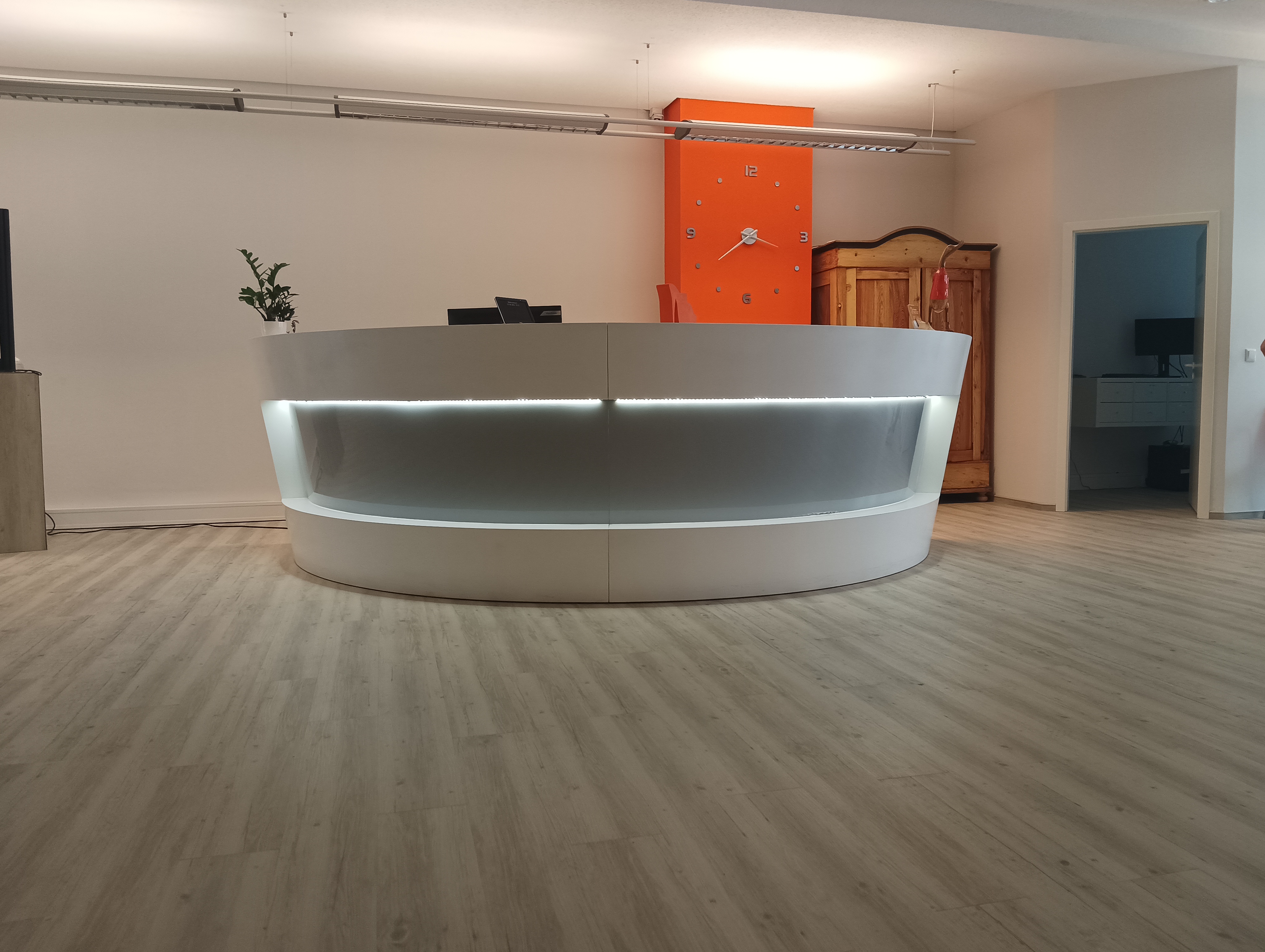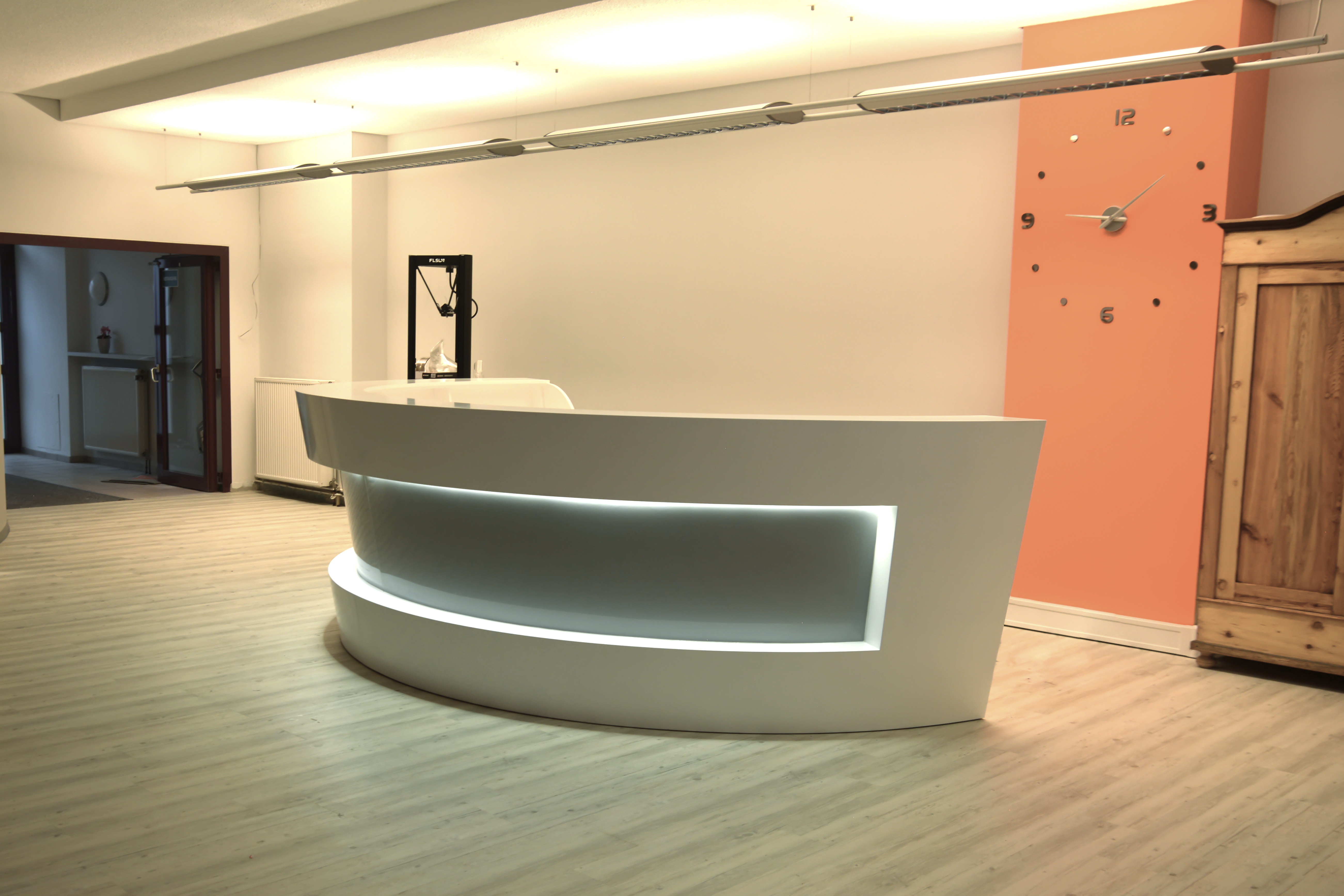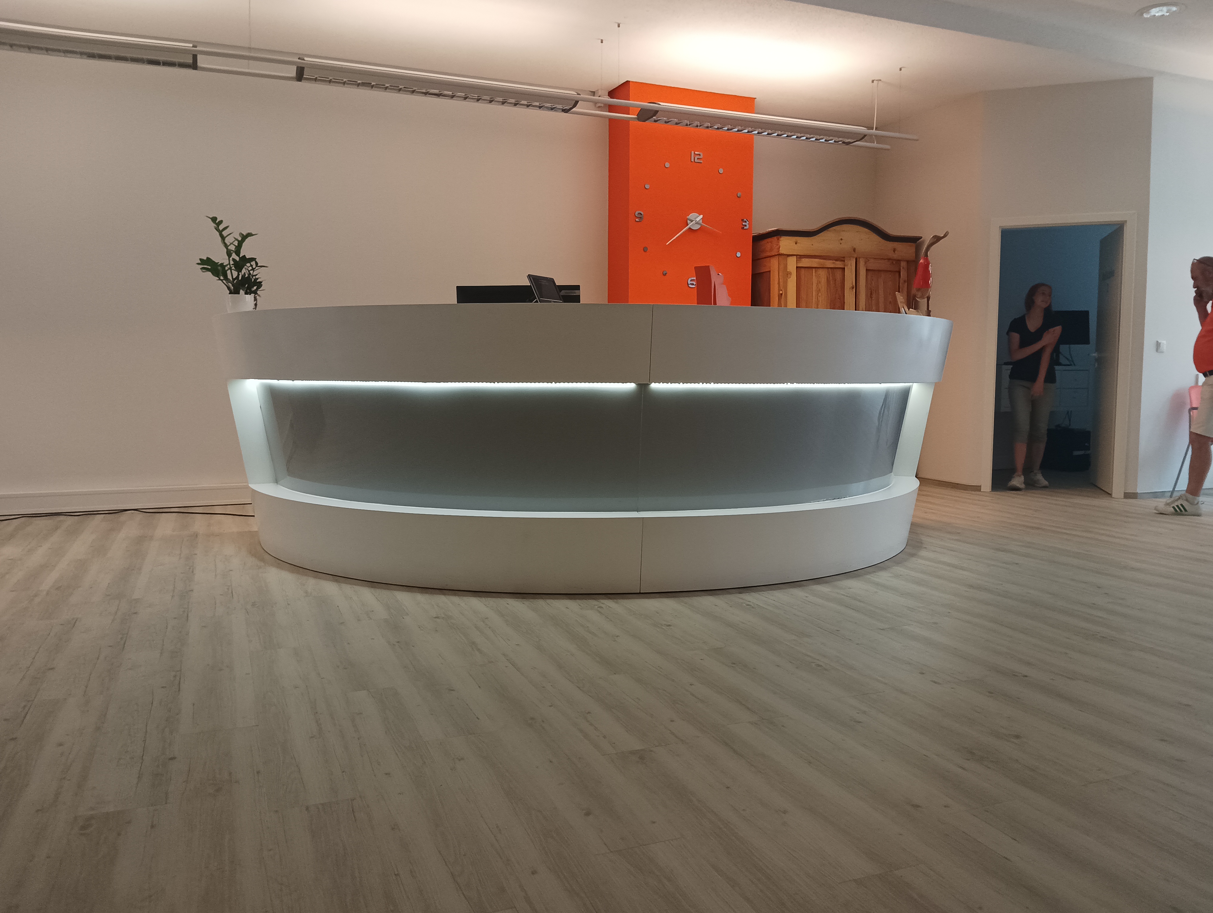 Łogodny łuk schylający się ku ziemi to wyrafinowana recepcja R206. Podwójne, obłe skosy wykonanane z laminatów z wcięciem kontrastującym z całą bryłą stworzą nadzwyczajną architekturę miejsca, które przez recepcję R206 będzie reprezentowane.