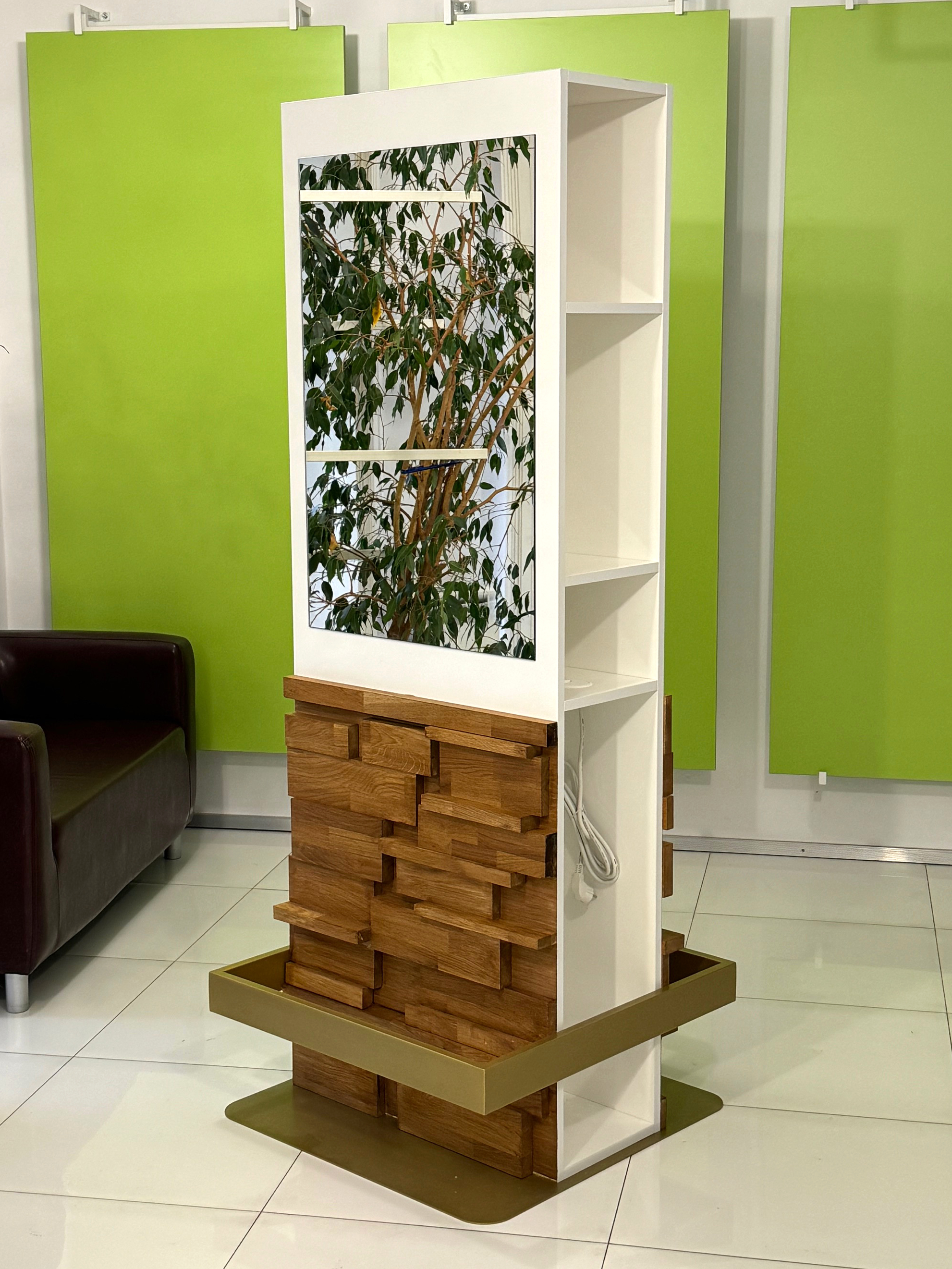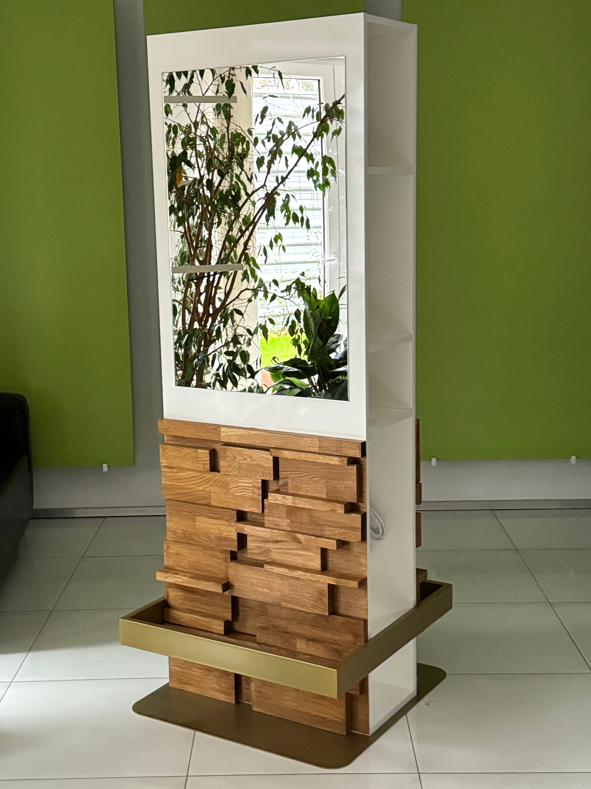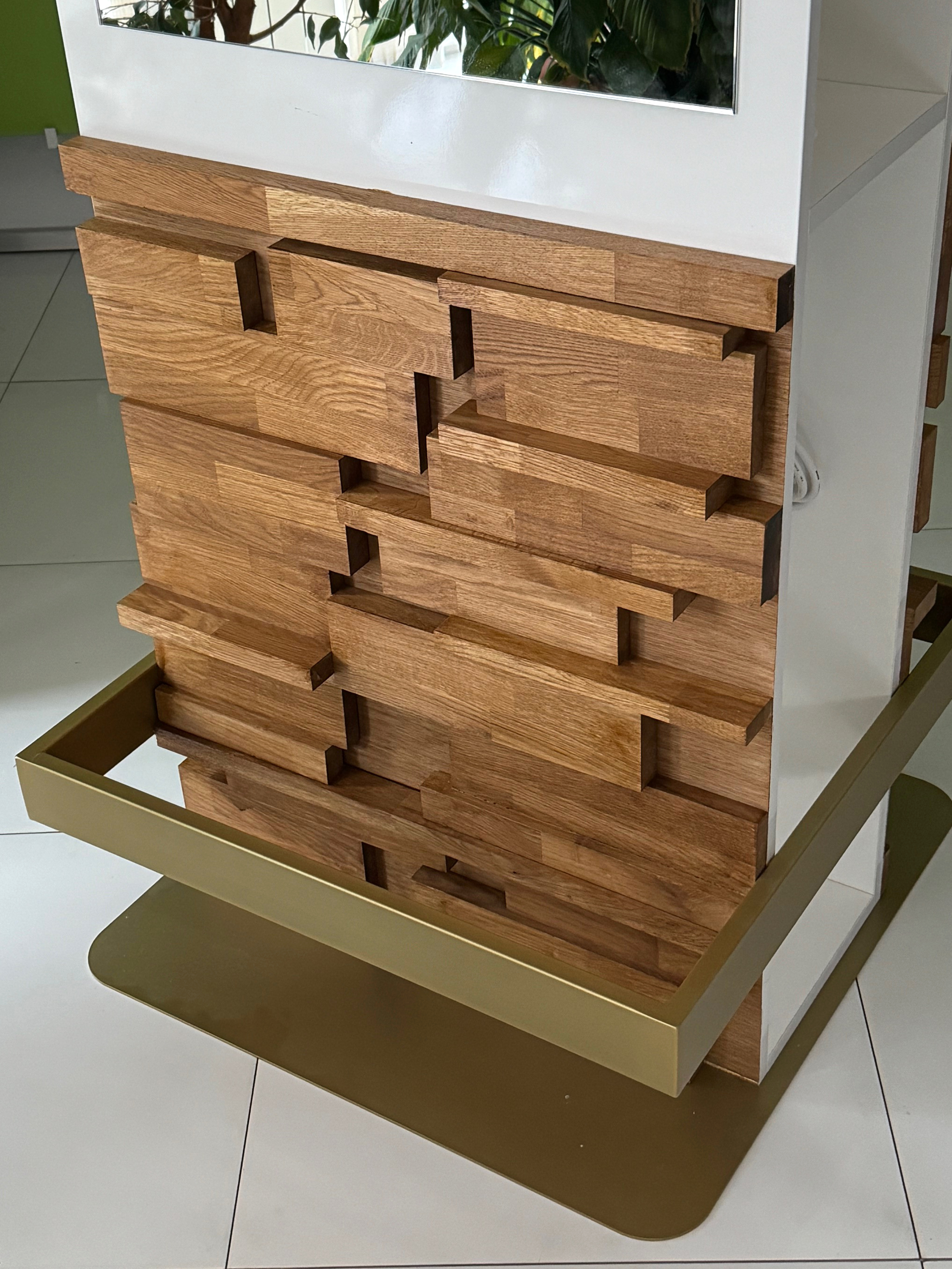 Płyta melaminowana i laminaty HPL, możliwe kolory do wyboru z palety kolorów. Dół ozdobiony litym drewnem dębowym. Metalowe podnóżek i podstawa malowany proszkowo na wybrany kolor z palety RAL.